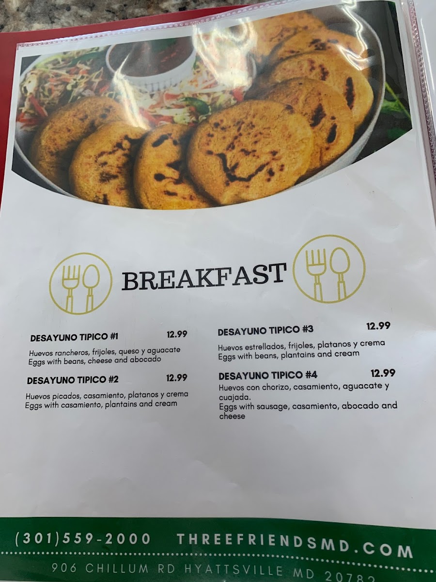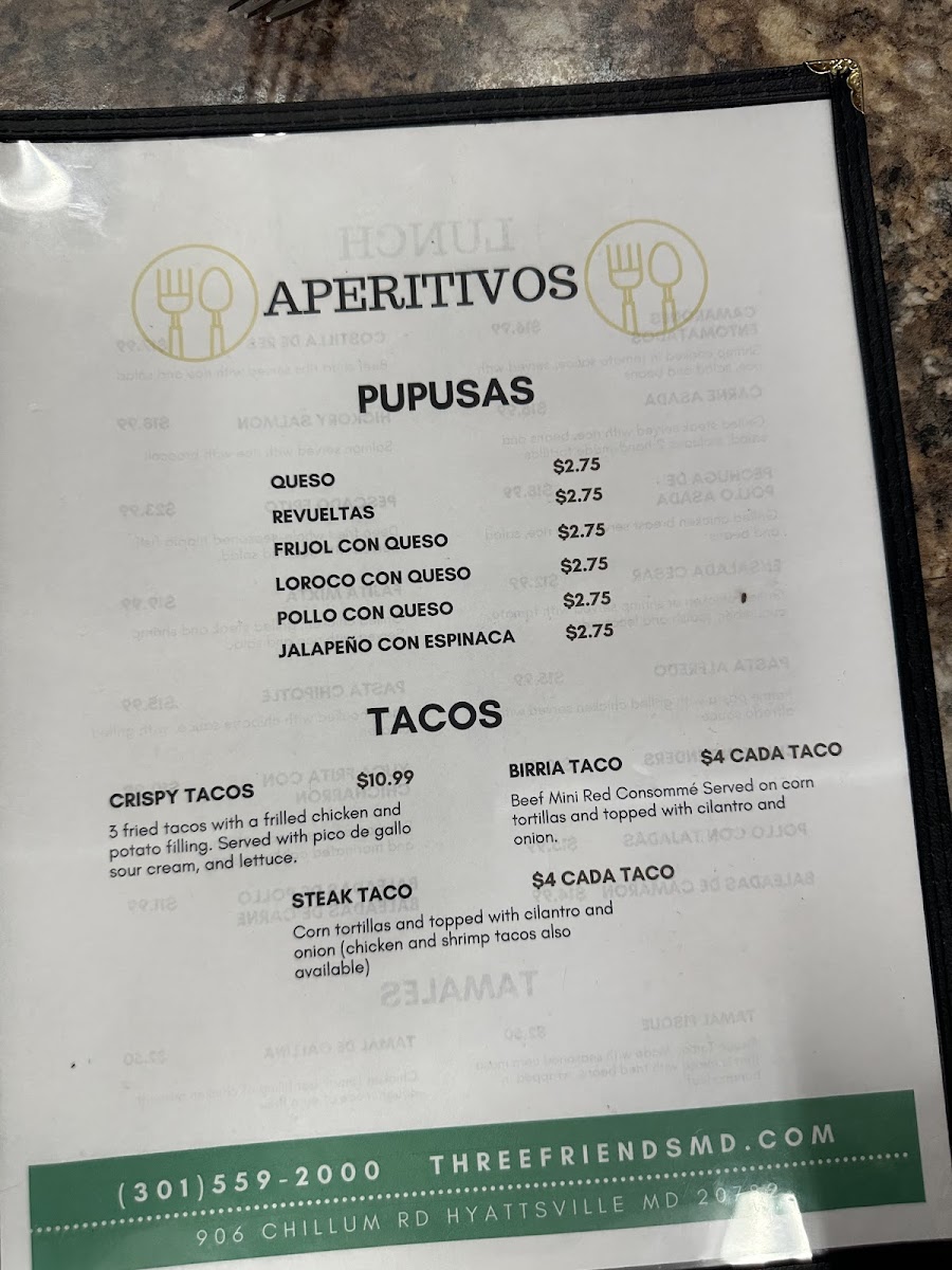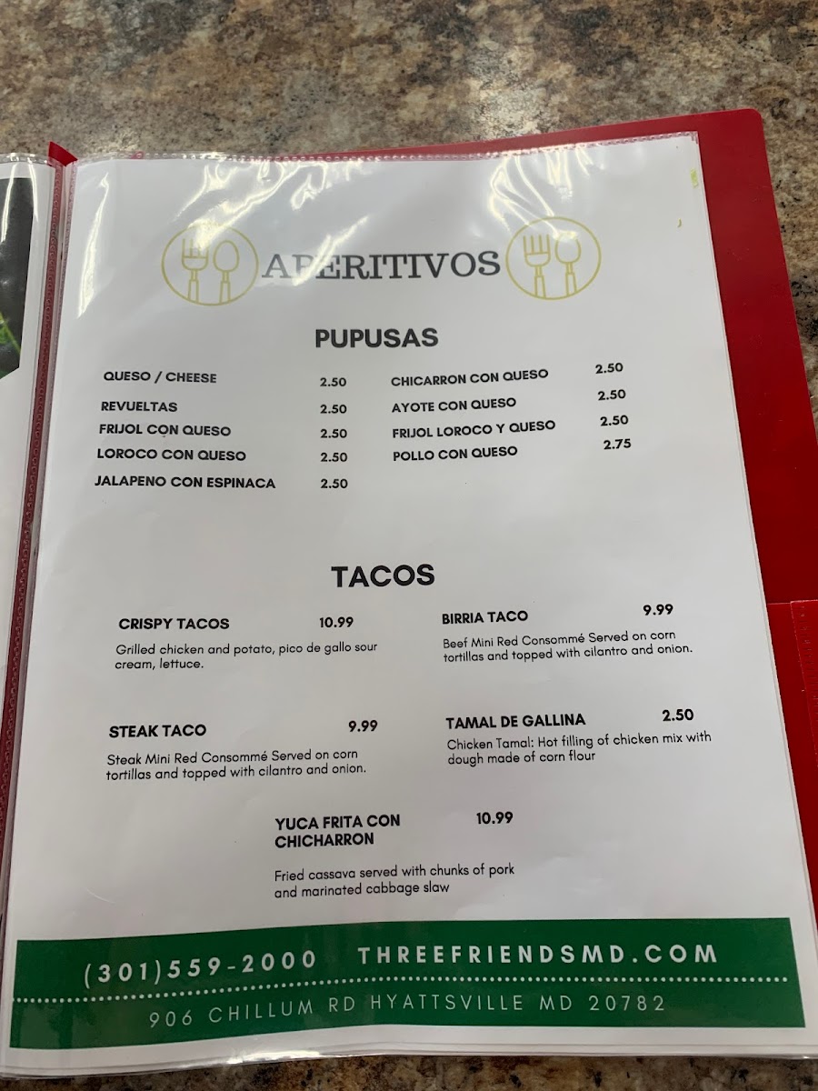 Pupuseria Three Friends offers a selection of delicious and traditional dishes, perfect for anyone craving authentic Salvadoran flavors. Their breakfast menu includes the Desayuno Típico #1, a hearty and flavorful choice for starting the day. On special occasions, such as Father’s Day, the restaurant serves the Especial del Domingo Día del Padre, featuring a mouthwatering Ribeye Steak con Camarones, combining juicy steak and tender shrimp for a memorable meal. For those seeking something a bit different, on Saturdays, the restaurant offers 3 tacos de birria, a delicious, savory option. The diverse offerings on the menu cater to various tastes, making Pupuseria Three Friends a great spot for both casual dining and special occasions.