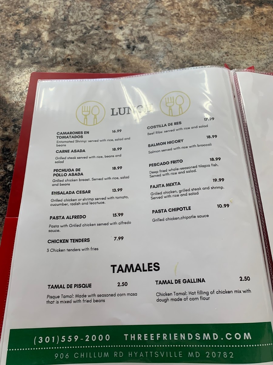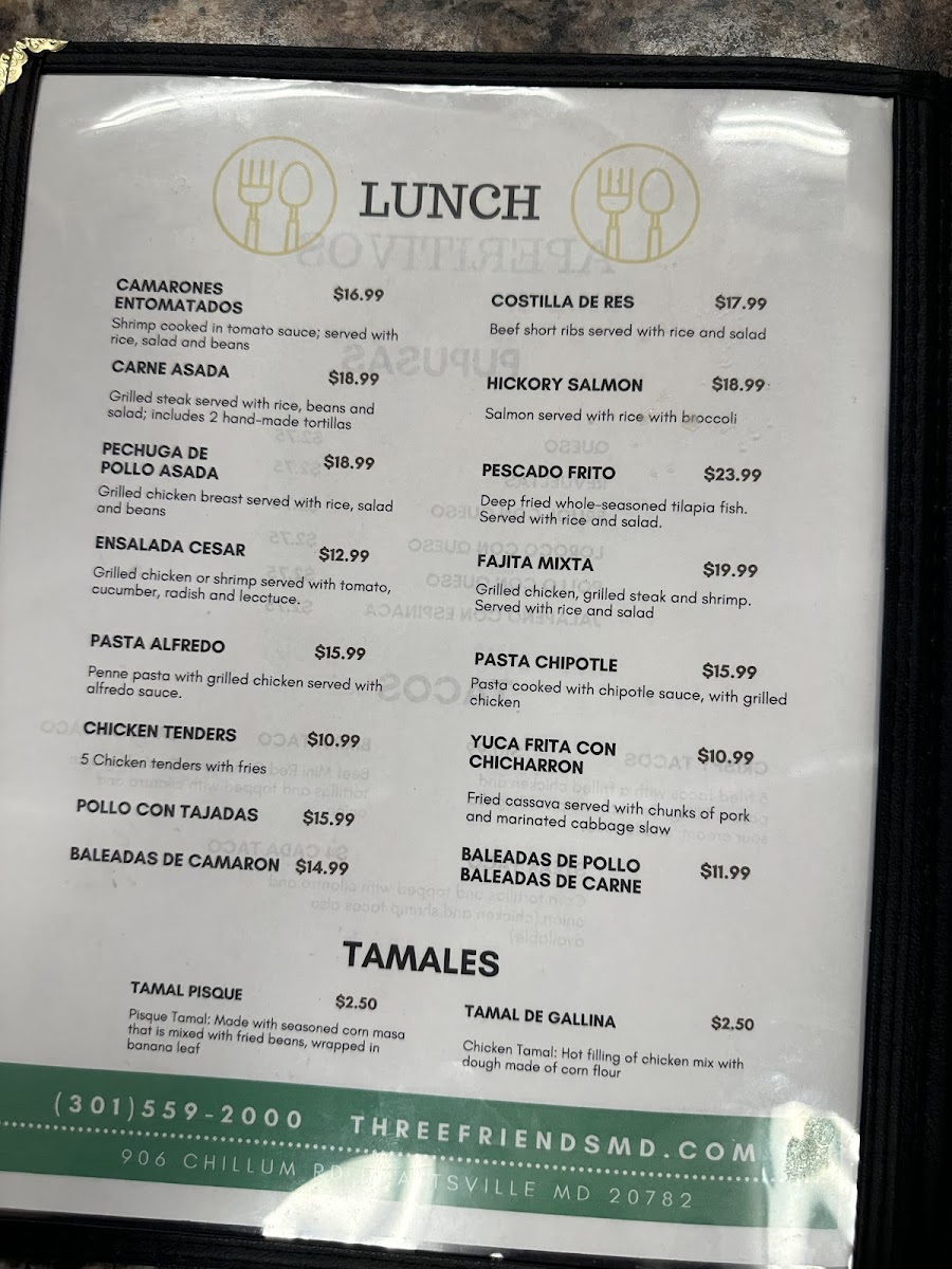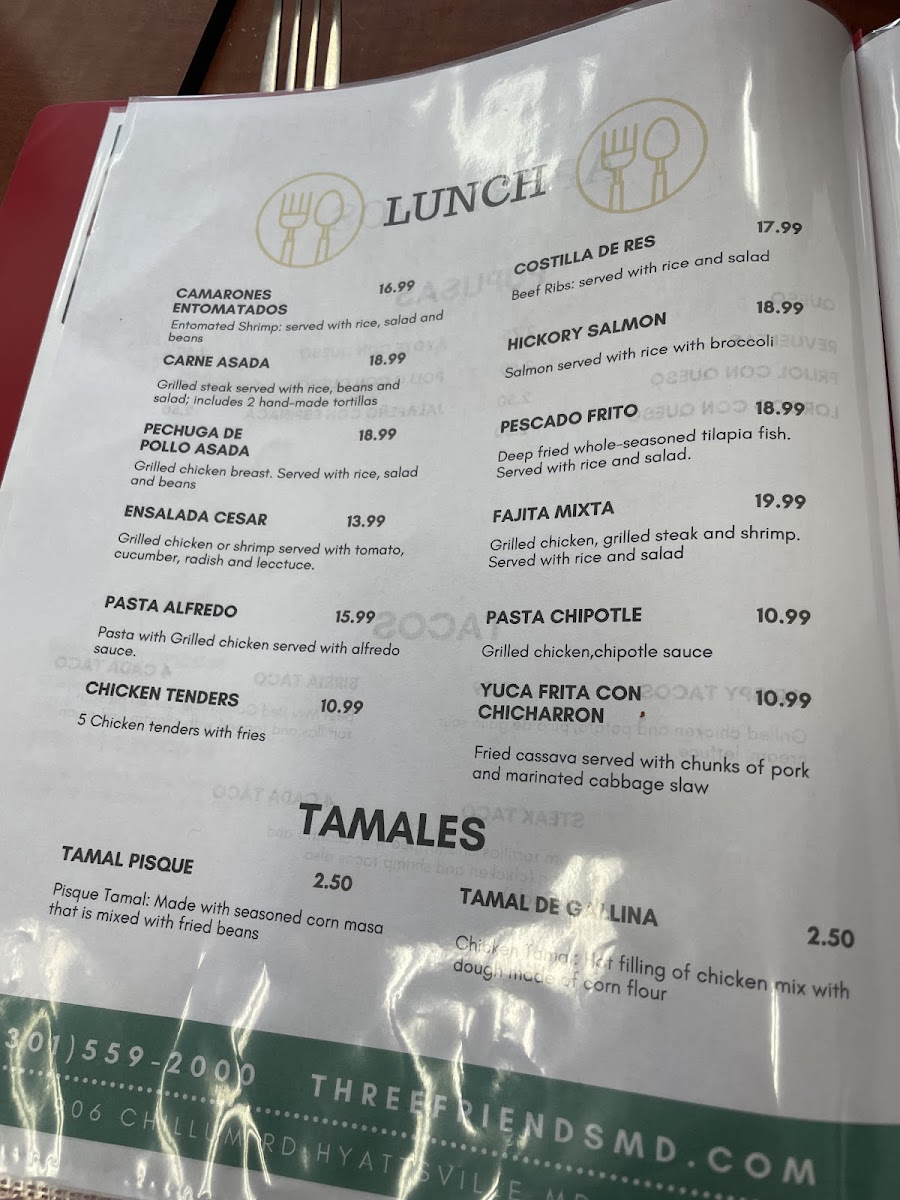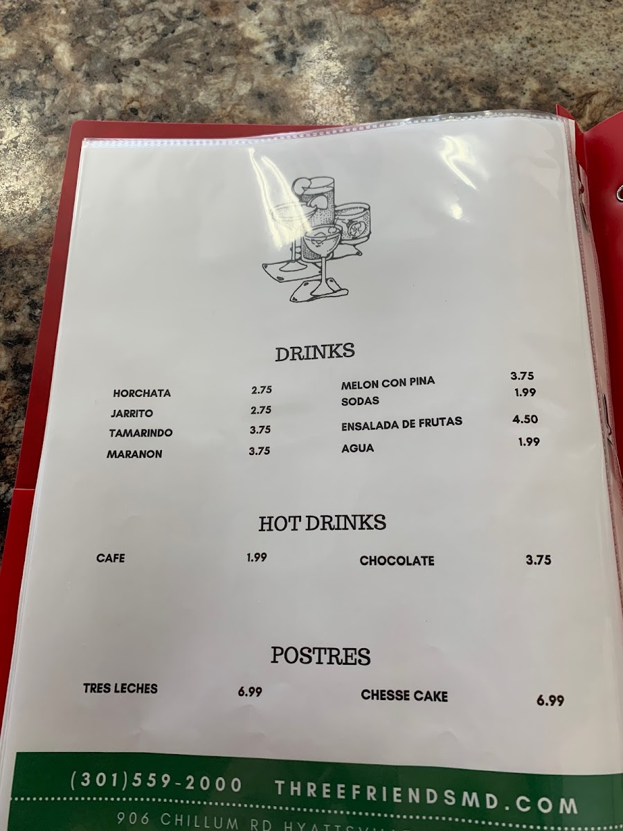 Pupuseria Three Friends offers a selection of delicious and traditional dishes, perfect for anyone craving authentic Salvadoran flavors. Their breakfast menu includes the Desayuno Típico #1, a hearty and flavorful choice for starting the day. On special occasions, such as Father’s Day, the restaurant serves the Especial del Domingo Día del Padre, featuring a mouthwatering Ribeye Steak con Camarones, combining juicy steak and tender shrimp for a memorable meal. For those seeking something a bit different, on Saturdays, the restaurant offers 3 tacos de birria, a delicious, savory option. The diverse offerings on the menu cater to various tastes, making Pupuseria Three Friends a great spot for both casual dining and special occasions.